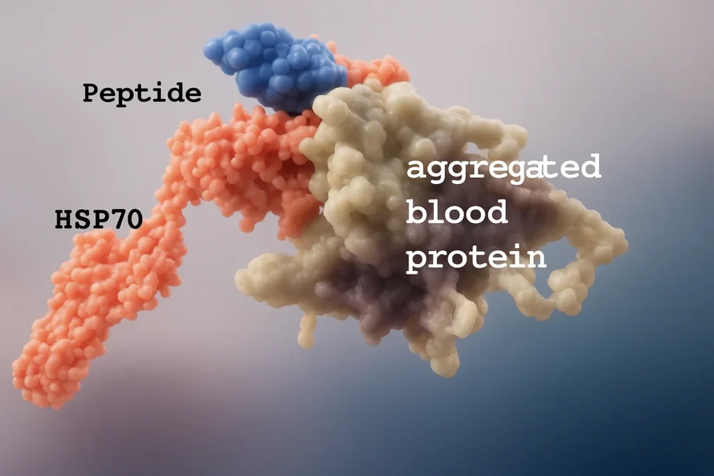 Peptides stimulate HSP70 to attack aggregated, nonfunctional blood proteins.